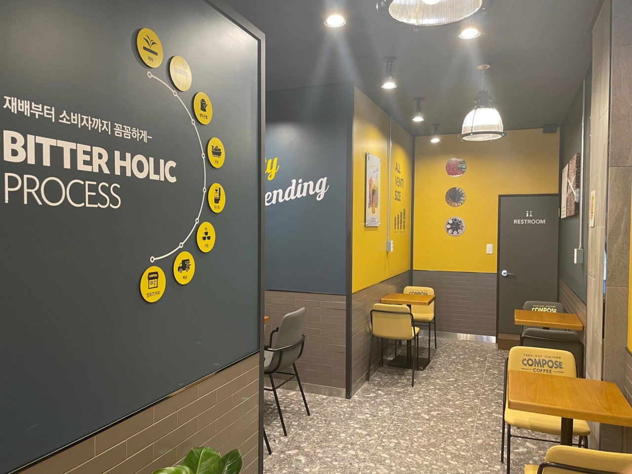 이 지점은 컴포즈커피 타지점보다도 매력적인 지점 중 하나로, 현대적인 인테리어와 편안한 분위기를 자랑합니다.