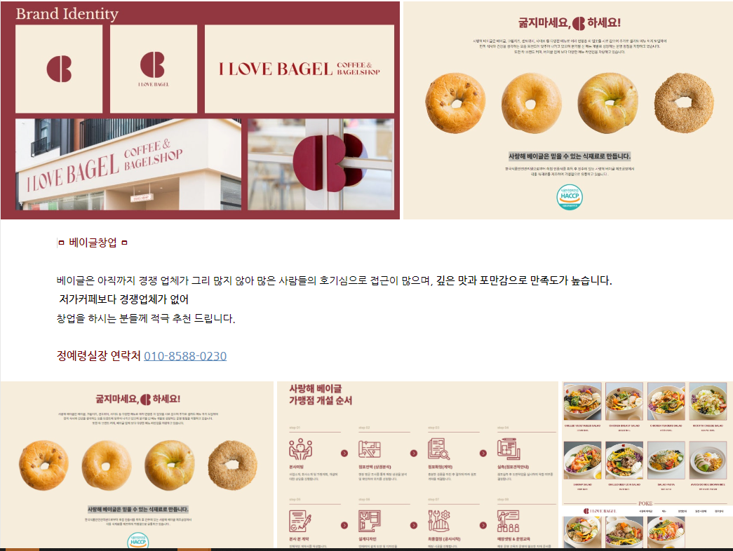 ㅁ 베이글창업 ㅁ 베이글은 아직까지 경쟁 업체가 그리 많지 않아 많은 사람들의 호기심으로 접근이 많으며, 깊은 맛과 포만감으로 만족도가 높습니다. 저가커페보다 경쟁업체가 없어 창업을 하시는 분들께 적극 추천 드립니다. 정예령실장 연락처 010-8588-0230 여러 브랜드들보다 완성도가 높고, 정체성이 완벽한 사랑해베이글창업 * 사랑해베이글 창업비용 * 사랑해베이글은 창업시 1억 초반 정도로 자금이 필요한데요, 15평~ 20평 기준으로 전체 모든 금액이 포함된 상황입니다. * 사랑해베이글 마진율 * 사랑해베이글은 샐러드전문점이라는 말이 나올 정도로 샐러드 맛집입니다. 늘 신선한 샐러드가 풍성한 사랑해베이글 사랑해베이글은 전체 음식의 재료비가 35% 선으로 일반 카페 재료비와 비슷하거나, 낮다고 보시면 되는데, 건기, 홍수. 겨울철등에 채소류 값이 올라가는 경우 40%까지 높게 잡기도 합니다, 하지만 높은 객단가가 인건비를 확 줄일 수 있고, 인건비가 계속 높아지고 있는 지금, 고정 지출을 두려워 하시는 분들께 추천 드립니다. 전체 금액의 25%~30%정도 마진율이 나오고 있는 사랑의베이글입니다. * 사랑해베이글 본사 미팅 * 사랑해베이글은 진해에 본사를 두고 있으며, 미팅시 진해서 혹은 울산, 부산등에서 매장 방문이 가능합니다.