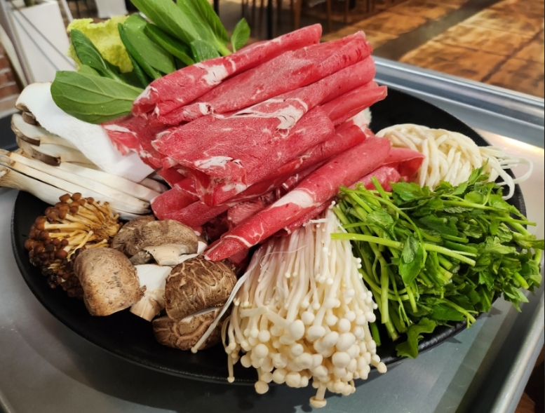 샤브는 한 타임에 많은 사람들의 수용이 관건이여서 넓은 평수에 다양한 음식을 뷔폐식으로 제공하는데