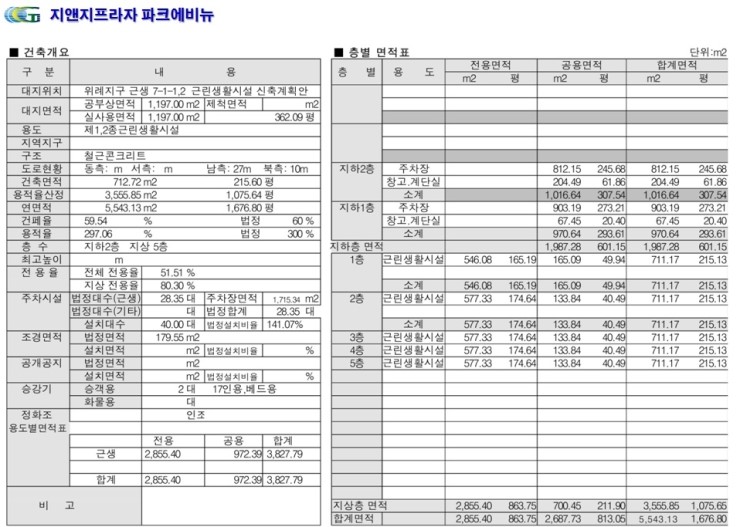 층 수: 지하2층 지상5층 주차시설: 법정28.35대 설치40대