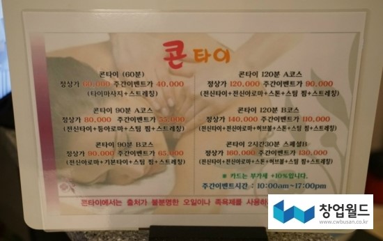 ------------------------------------------------------------------ ☞ 3~4인이 마사지를 받을수 있는 곳은 이 매장에서 젤 큰방 ☞ 주간 이벤트 10회 하면 1회 서비스 해줌 ☞ 1번하는데 6만원 ☞ 부산쪽에는 가을에 창업생각, 앞으로 체인점 늘일 생각있음 ☞ 룸8개(커플실), 1인실 1, 4인실 1 커프실 6 잠자는 방 1 직원들 방 1 ☞ 관리사 -7명 (태국분들만), 스텝직원, 주간 미들 야간 ☞ 24시간 연중무휴